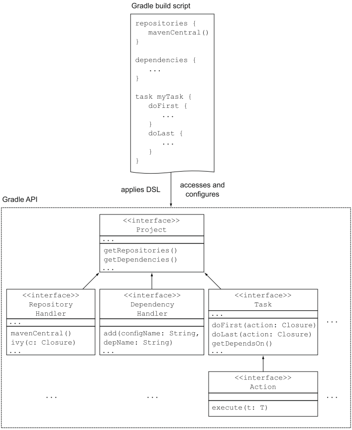 - Gradle Script -> publish artifact -> Maven/Ivy repository -> download dependency -> Gradle Script